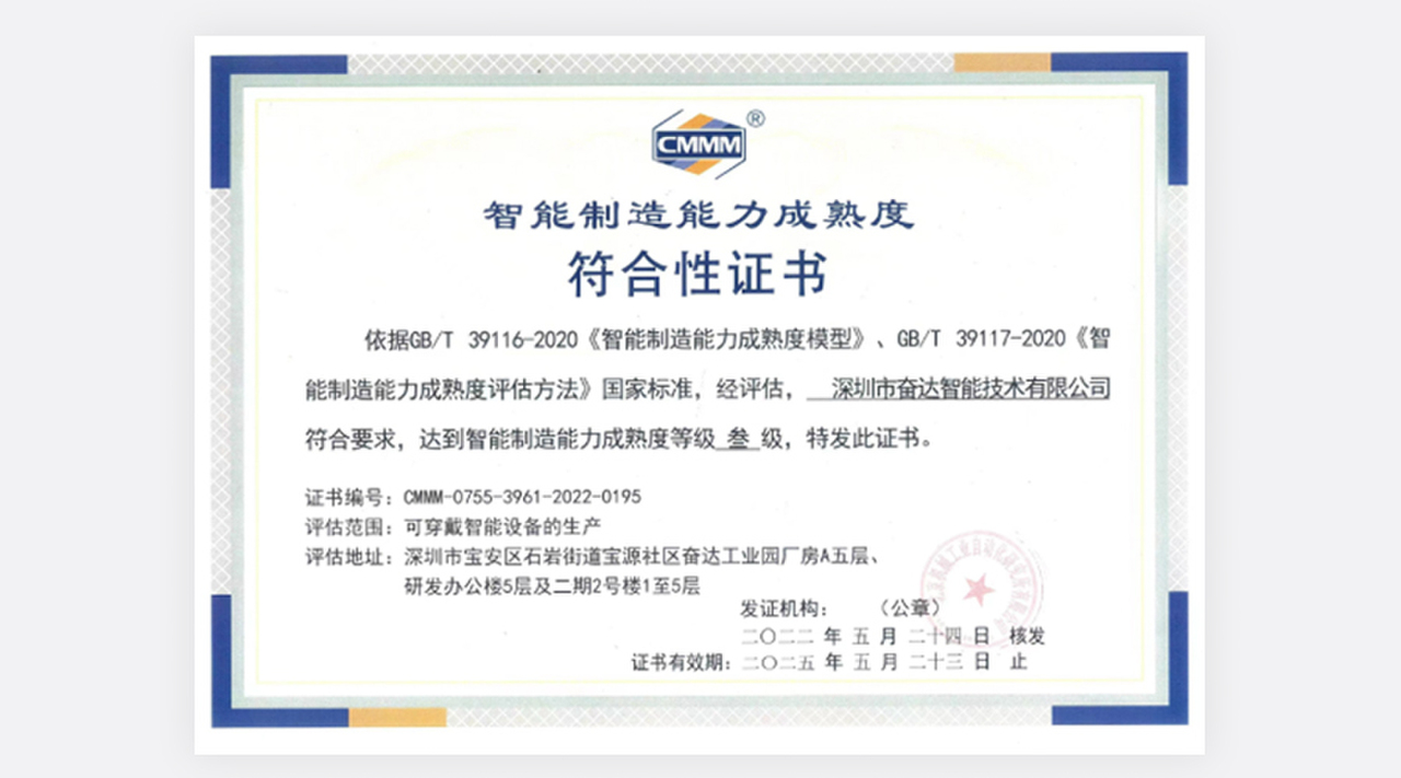(图为完美体育·WM智能技术智能制造能力成熟度三级评估证书) 智能制造能力成熟度模型描述了企业实施智能制造要达到的阶梯目标和演进路径,提出了实现智能制造的核心要素、特征和要求,从人员、技术、资源、制造等要素维度,从低到高分五个成熟度等级综合评价企业数字化、网络化、智能化发展水平。其中,一级为流程化管理(规划级),二级为数字化改造(规范级),三级为网络化集成(集成级),四级为智能化生产(优化级),五级为产业链创新(引领级)。完美体育·WM智能于2015年落户深圳宝安区,作为深圳市完美体育·WM科技股份有限公司的控股子公司,专注于可穿戴设备、运动健康、移动医疗和电声等领域的技术、产品和内容整合的研究、制造、生产;致力于与全球运动健康领域领先的头部品牌企业合作开发有竞争力的产品,具有为客户提供从创意设计、研究开发到产品实现的全流程技术实力。为了快速推进公司智改数转,实现高质量发展,本次CMMM评估团队由完美体育·WM智能CEO肖晓发起,智能办公室牵头,联合制造中心、质量中心、信息中心、行政中心、采购部和人力资源等部门协同推进、共同参与。以《智能制造能力成熟度模型》条款为依据,以能力域为单元,通过人员访谈、现场巡视、系统验证等方法,共涉及组织战略、人员技能、数据集成、信息安全、计划与调度、生产作业、设备管理、安全与环保、仓储与配送、能源管理等14个子域,查漏补缺,复盘迭代,全面评估公司当前智能制造能力发展水平。此次评估是对企业智能制造能力的一次全面检验,帮助企业在智能制造转型升级阶段识别差距、确定目标、实施改进。本次共有45家企业通过智能制造成熟度评估,其中三级以上企业15家。创新是企业核心竞争力的源泉,完美体育·WM科技将以智能制造能力成熟度三级为起点,进一步强化智能制造相关组织建设和人才管理,加快构建智能制造发展生态,深入推进数字化转型、智能化升级,不断增强公司竞争力。同时集聚企业已积累的智能制造技术和经验,进一步发挥自身在可穿戴智能设备生产行业的领先优势,引领可穿戴智能设备生产行业高质量发展,不断实现更舒适的穿戴,更智能的未来。
